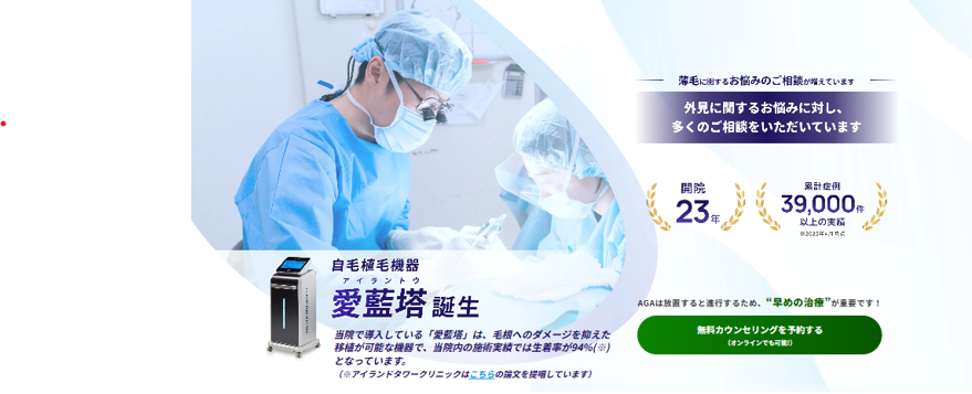 日本国内シェアNo.1の植毛専門クリニック。累計症例数35,000件以上(2024年時点)を誇りt、10年以上無事故・無違反という実績があります。
