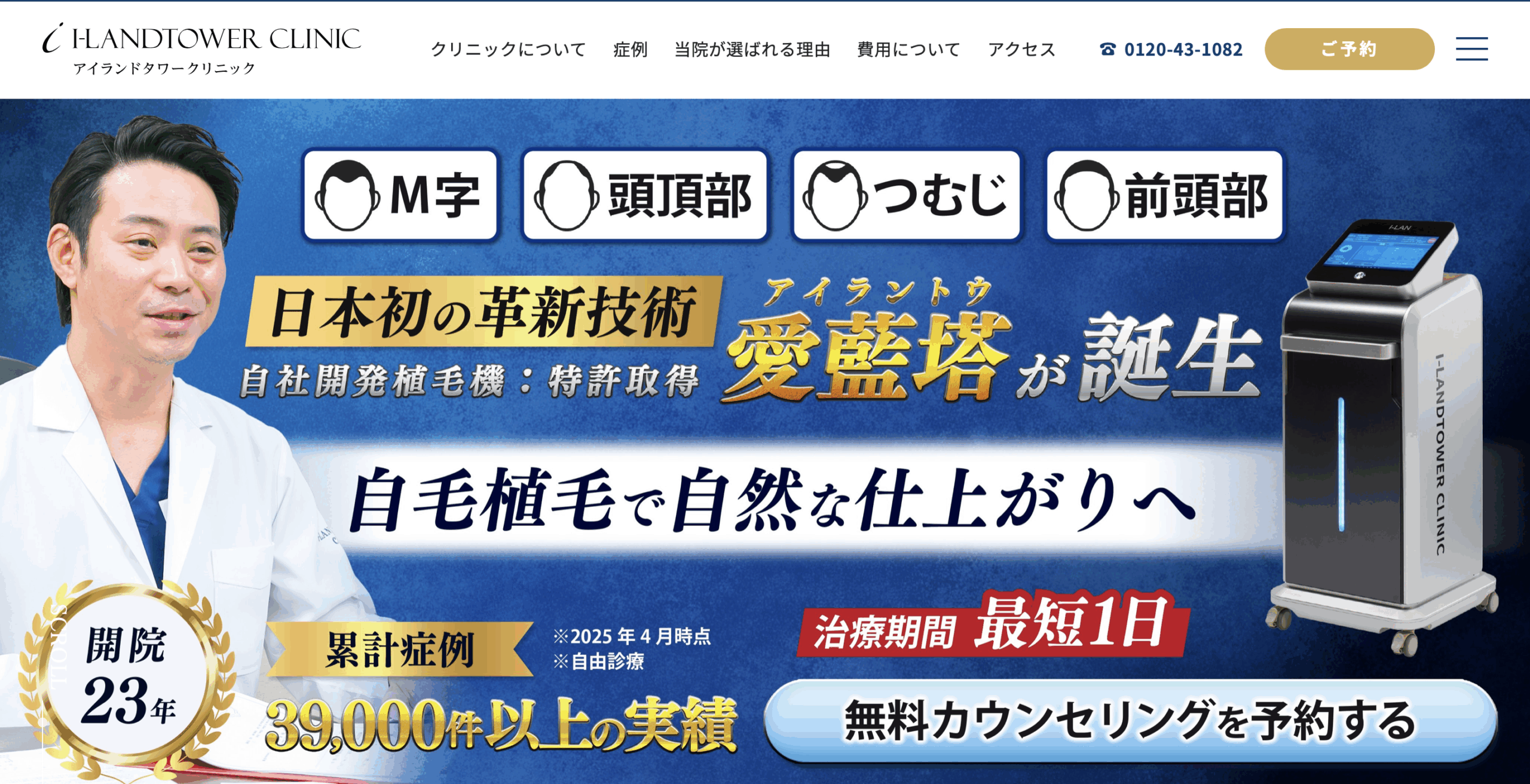 アイランドタワークリニック新宿院は、全国展開する自毛植毛専門クリニックの本院として最も多くの症例実績を誇ります。