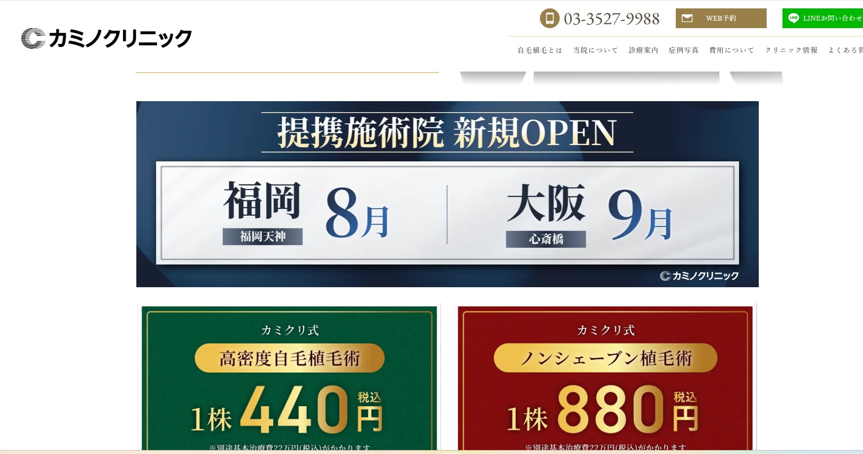 | 施術費 | カミクリ式植毛:基本治療費220,000円+440円/グラフト ノンシェーブン植毛:基本治療費無料+880円/グラフト |