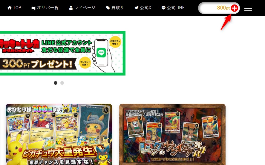 ログイン後、ポイント数右の「+」ボタンをタップ。