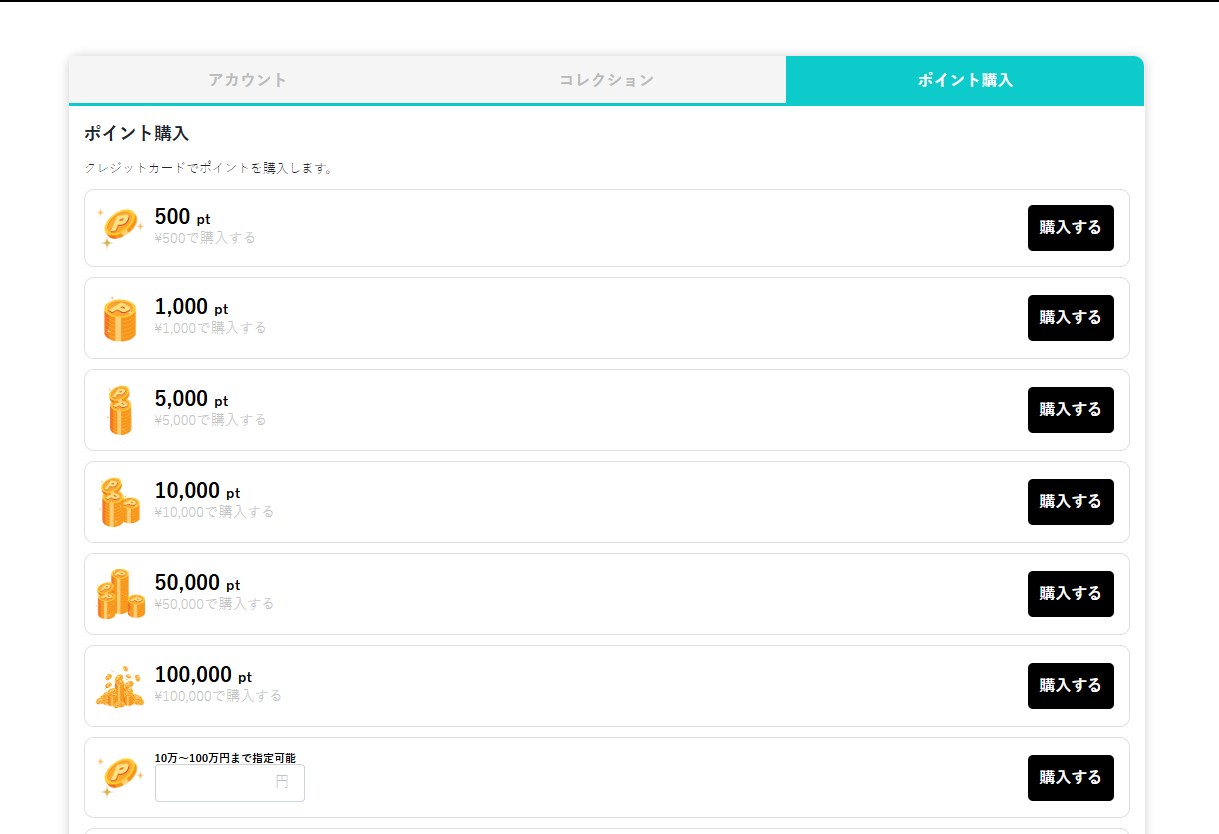 | 100,000 pt〜1,000,000 pt | 金額を指定して購入 |