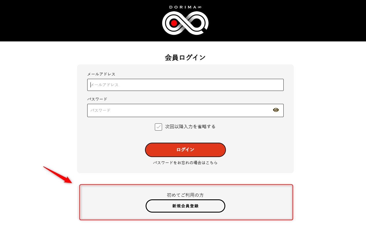 まずDORIMAの公式サイトにアクセスし、「ログイン」ー「新規会員登録」ページへ進みます。