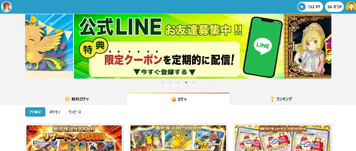 | 特徴 | 高額当たりを狙える“夢重視”のガチャ構成 | 1口1円から引ける豊富なオリパを展開。透明性のある表記や迅速発送にも注力 | 低価格から高額まで幅広い価格帯のオリパがあり、演出や還元率もユーザー評価が高い | 高還元率ガチャや限定キャンペーンが豊富 | 初回無料の「ばら撒きガチャ」やログインボーナスがあり、無課金状態でも楽しめる |