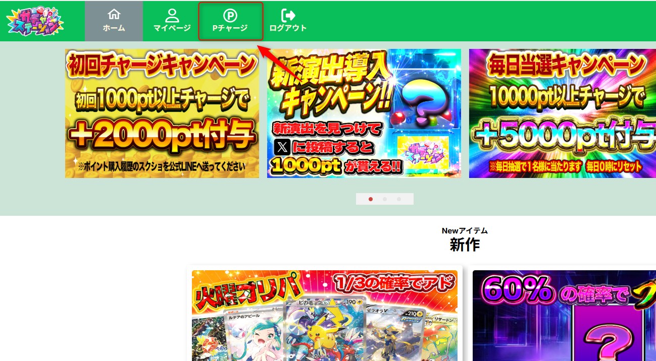 会員登録が済んだら、ログイン後画面左上「Pチャージ」ボタンをタップ。