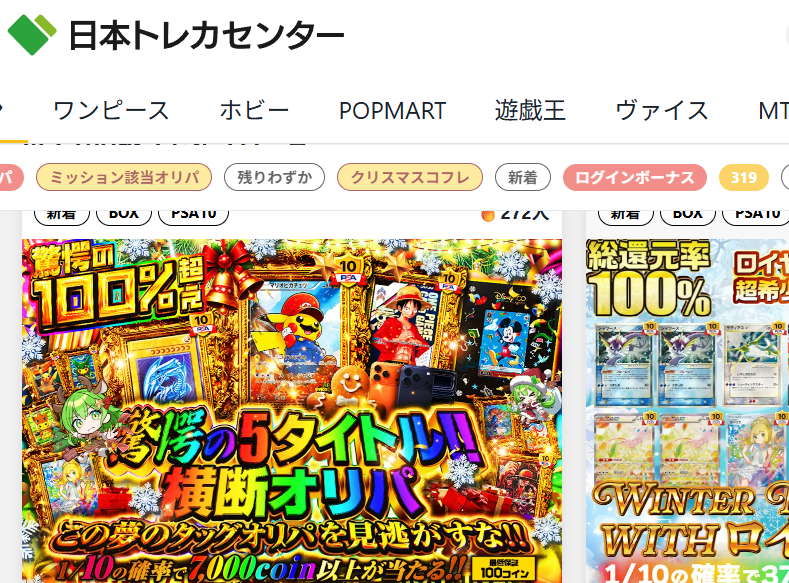 日本トレカセンターは、ポケモンカードやワンピース、遊戯王、ヴァイス、MTGなど幅広いジャンルを取り扱うオンラインオリパサイトです。
