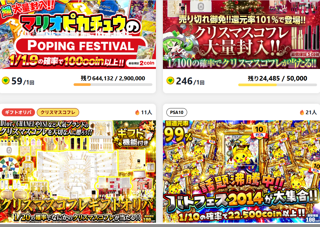 スニーカーやホビー商材、POPMARTなど異色ジャンルのオリパも展開されています。