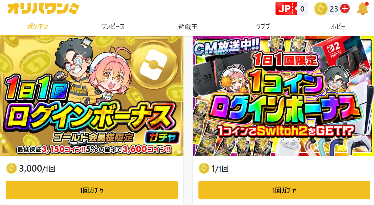 登録直後の24時間限定で引ける特別オリパが用意されているのも特徴。