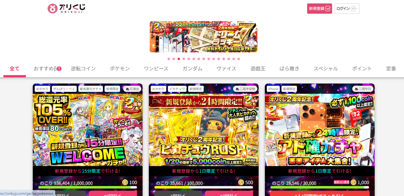 オリくじは公式で“0円で楽しめるオンラインオリパ”を掲げ、ログインボーナスや招待ポイントで無料オリパが引ける機会があり、初めての方でも参加しやすいサービスです。
