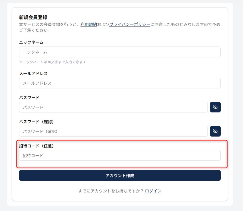 登録後は招待コード欄を再入力できないため、必ず登録前に準備しておきましょう。