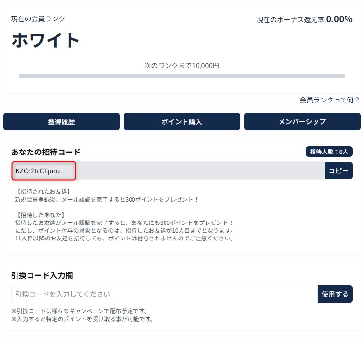 コードをSNSや掲示板で共有すれば、招待した人数分だけポイントを獲得できます(上限10人)。