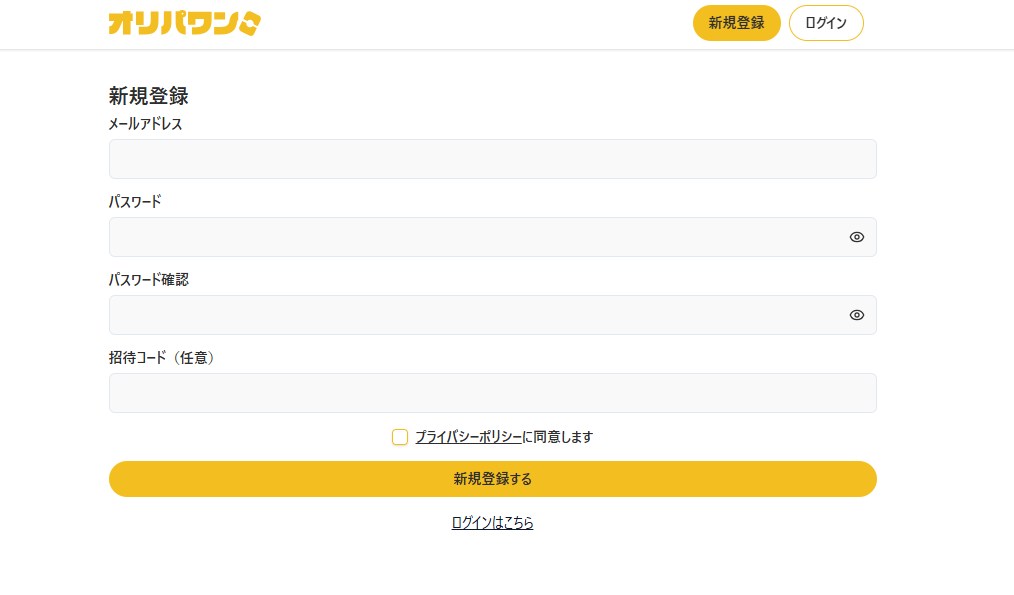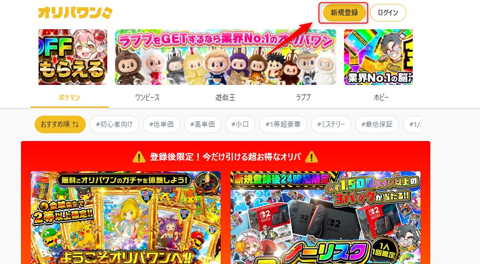 オリパワン公式サイトにアクセスし、トップページの「新規登録」ボタンをタップします。