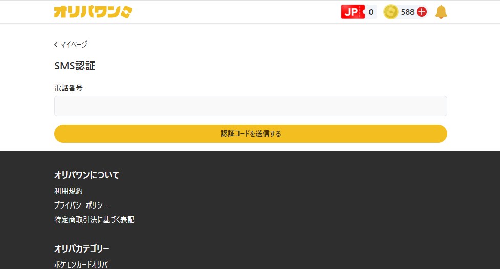 次に、本人確認のためSMS認証を行います。(ログイン後マイページ内)