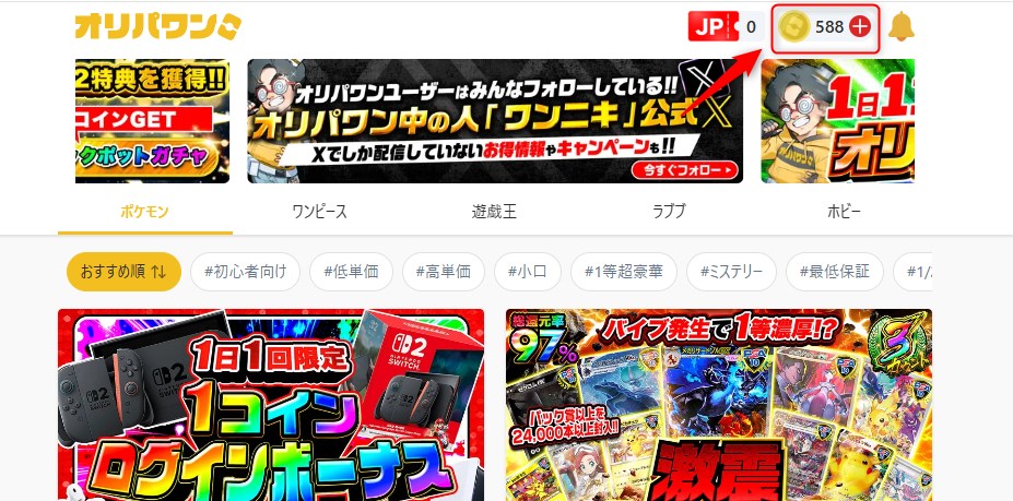 オリパワン公式サイトまたはアプリにログインし、マイページやメニューから「コイン購入」ボタンをタップします。(新規登録がまだの方は、登録とSMS認証を済ませてから進めます)