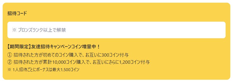 さらにブロンズランク以上になると自身の招待コードを使ってコイン大量ゲットも可能です。