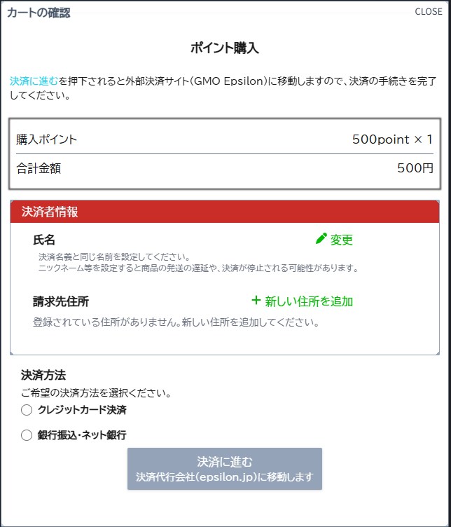 決済画面で氏名、住所を入力し決済方法を選びます。