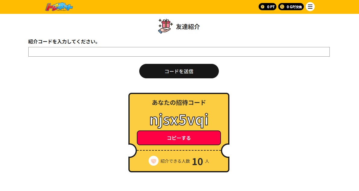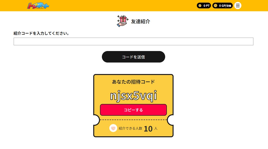 トレネットに新規登録後に入力すると、あなたと紹介者の双方にポイントが付与されるお得なコードです。無料ポイントでオリパを試せるため、最初のスタートを強化できる仕組みになっています。