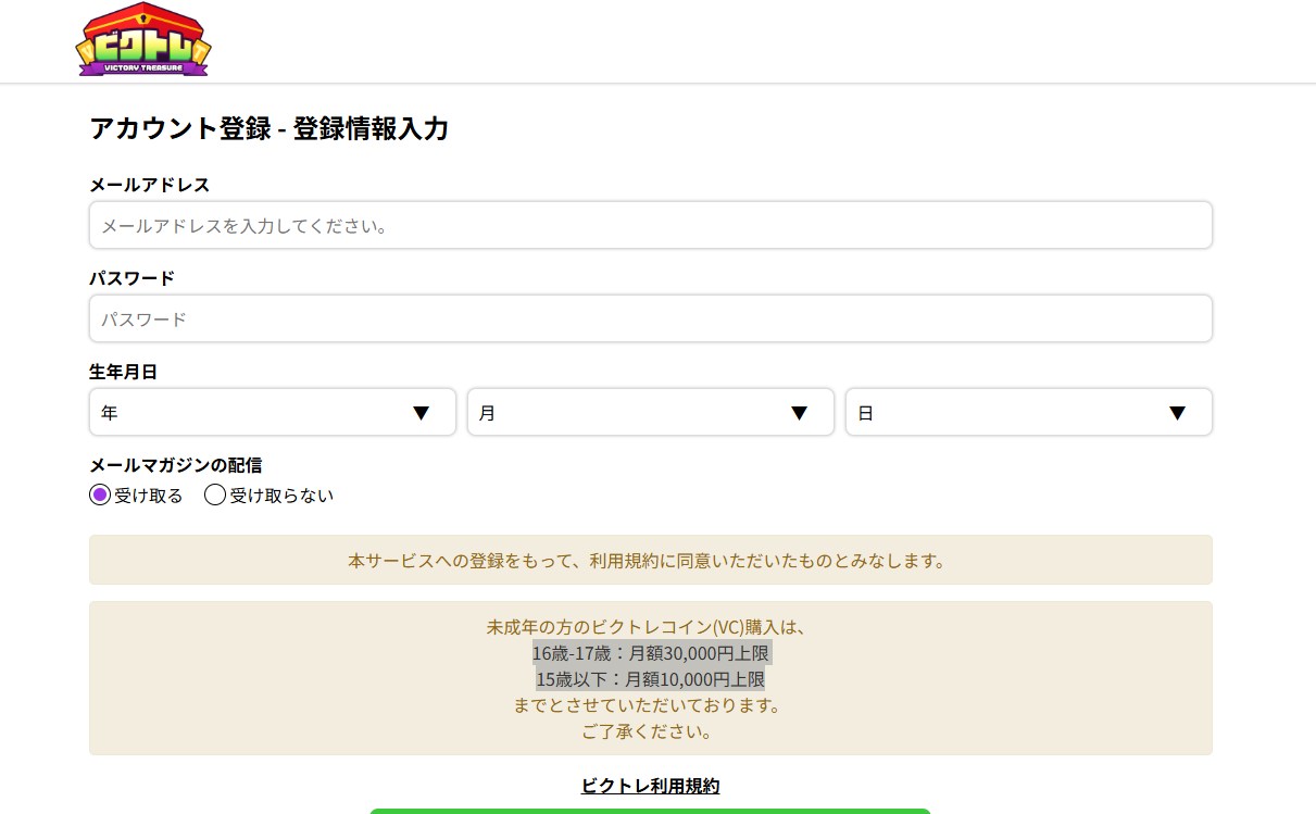 新規登録フォーム内にある、「メールアドレス」、「パスワード」、「生年月日」を入力します。
