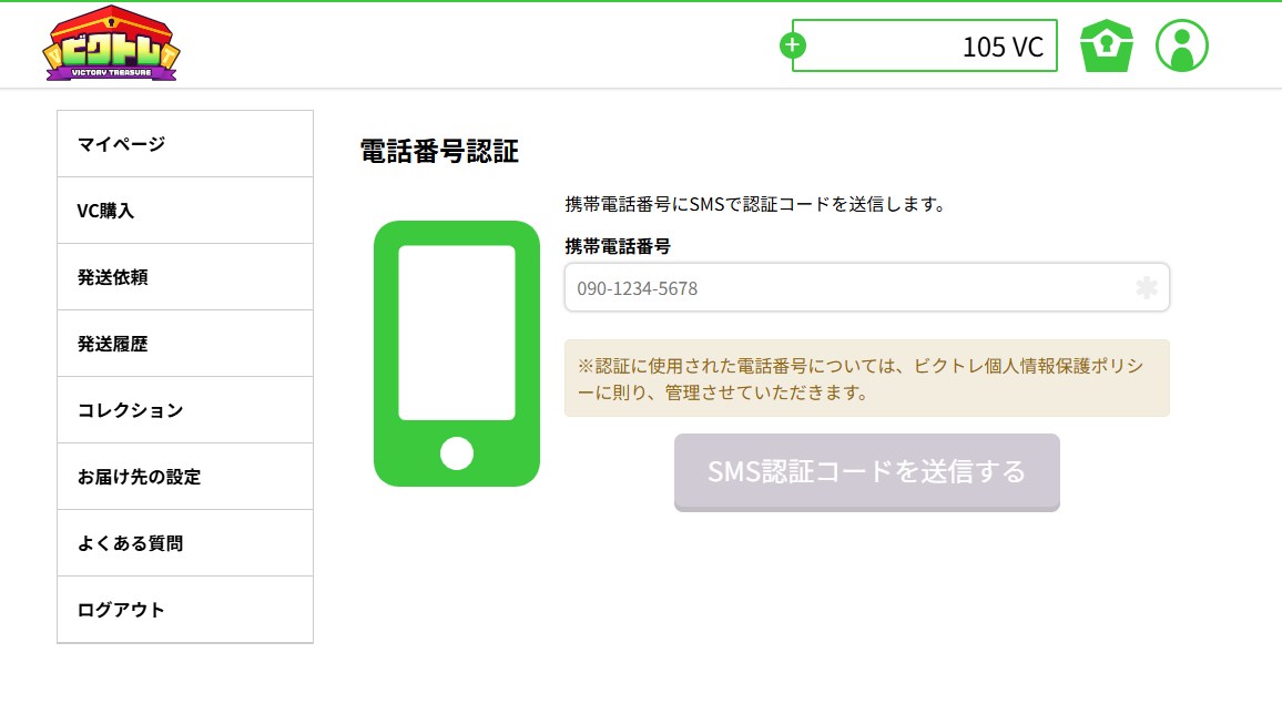 ログイン後マイページの「電話番号認証」から電話番号を入力して認証を行います。
