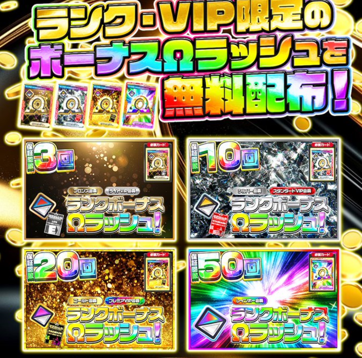 イベント時、不定期で開催されるランク・VIP限定のボーナスΩラッシュは、ランクを上げる最大の恩恵!