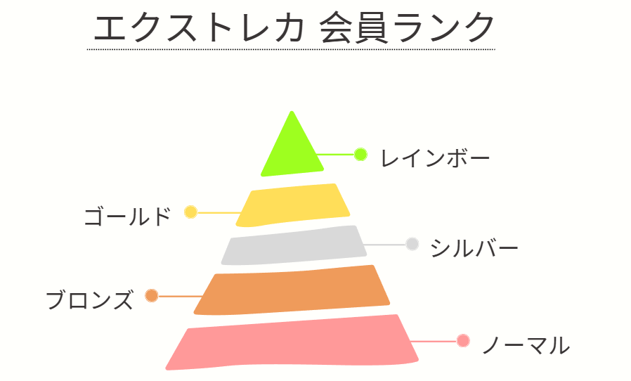 エクストレカの会員ランクは、ノーマル、ブロンズ、シルバー、ゴールド、レインボーの5段階に分けられています。