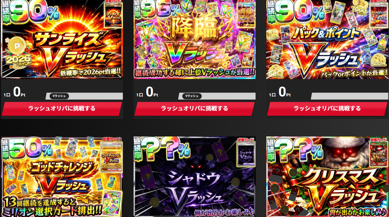 Vラッシュは、BOX確定やパック確定、最低10,000pt確定など種類が多く、それぞれに継続率が設定されております。