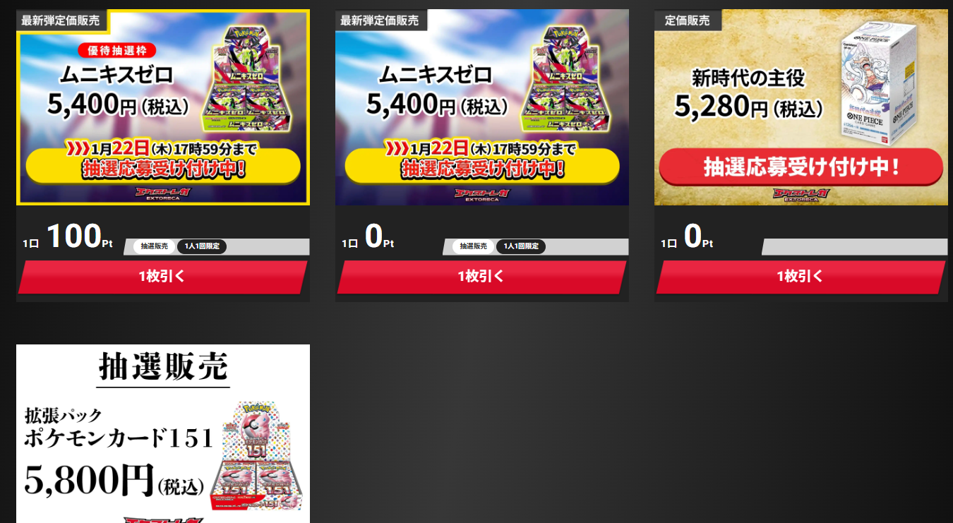 BOXの入手方法が限られ、高騰をみせる中、エクストレカは定価または割引価格で抽選販売してくれます。