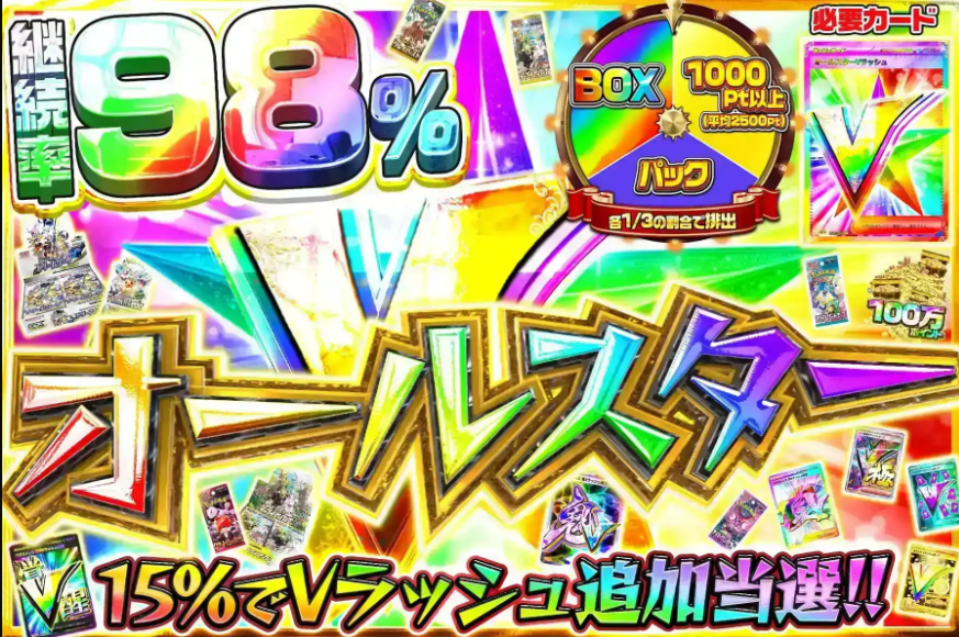 継続率98%、BOX・パック・1,000pt以上が1/3の割合で当選する安定型のVラッシュ。