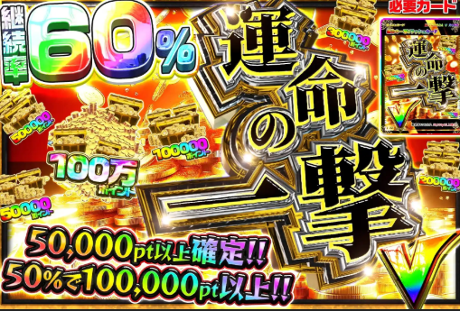 50%の確率で100,000pt以上!続かなくても最低50,000ptもらえる安心感、続けばポイント爆伸び。