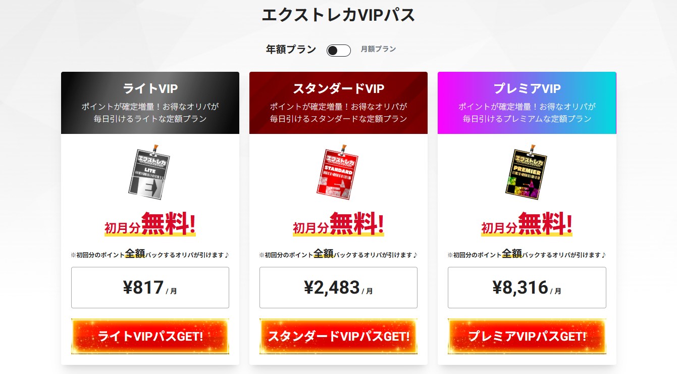 エクストレカには、通常会員よりお得に遊べる「VIPパス」という月額プランが用意されています。