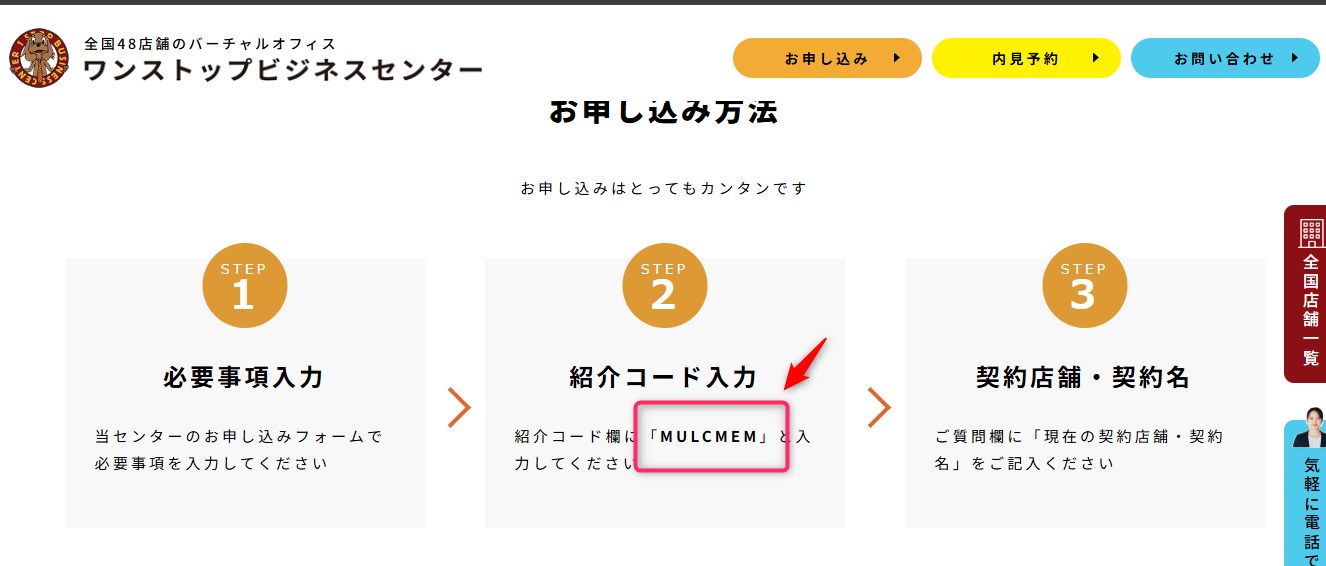 ワンストップビジネスセンターの紹介コードとは、初期費用(10780円)無料+月額利用料(5280円~)3か月分無料になる特典を受けるために必要なコードです。