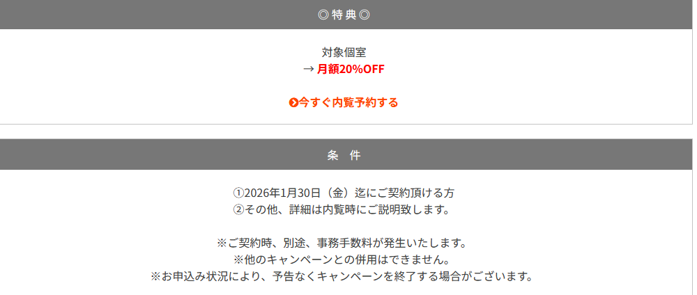 - 割引プラン: 若者・女性・シニア・障がい者向けに初期費用+1ヶ月分月額が無料 (条件:1年以上・年払い)