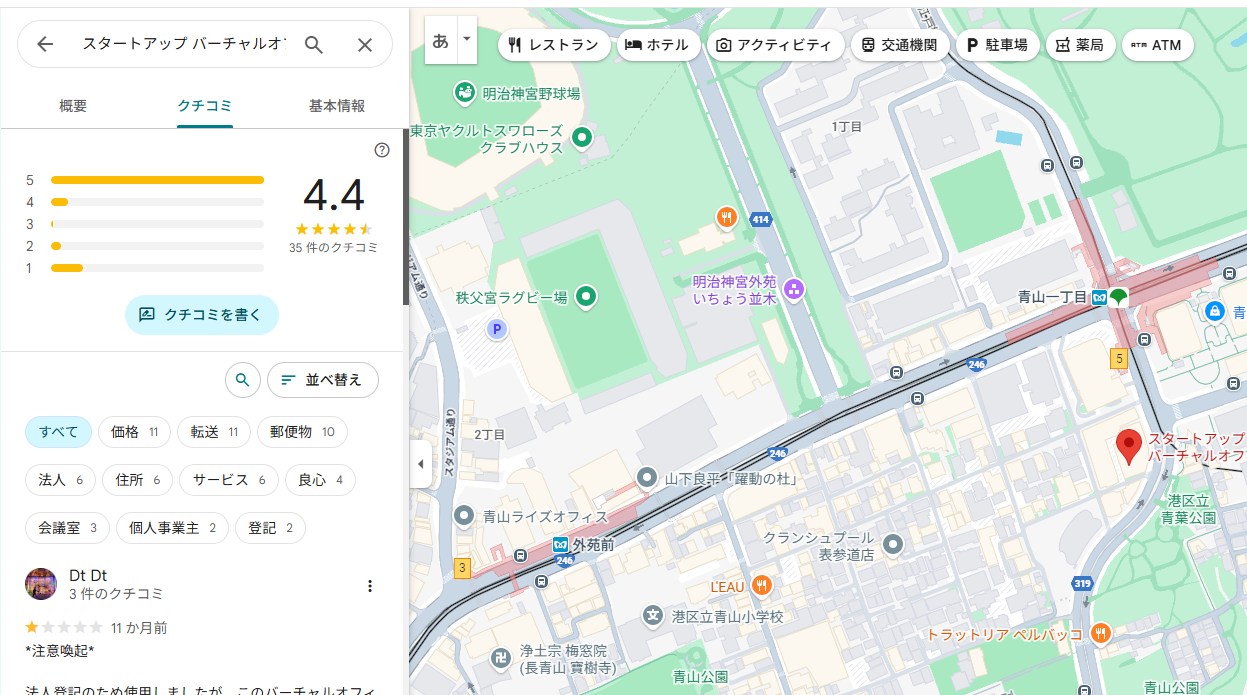 googleマップでスタートアップバーチャルオフィスの口コミを調査したところ35件の口コミが寄せられており、平均4.4と高評価です。(2025年11月14日時点)