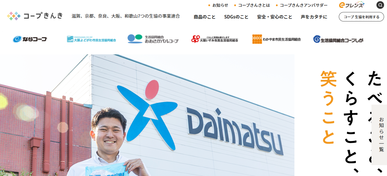 コープきんきは、滋賀・京都・奈良・大阪・和歌山の生協が連携した事業連合として、組合員の暮らしを支える商品やサービスを展開し、ネット注文の宅配「eフレンズ」を通じて生鮮食品から日用品まで幅広い商品を毎週自宅へ届けられる仕組みを整えています。