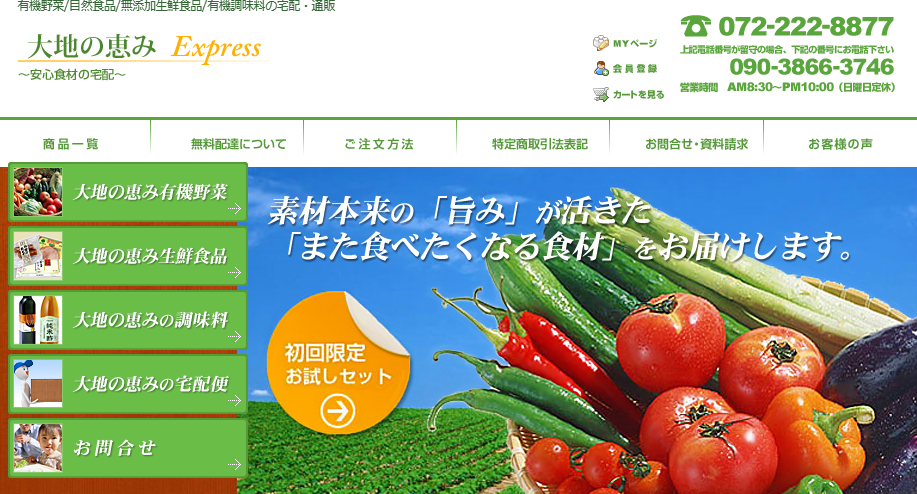 大地の恵みExpressは、全国の農家から仕入れた野菜の中から、有機認定野菜など品質に配慮した商品を選び、素材の良さを大切にしながら家庭に届ける宅配サービスです。