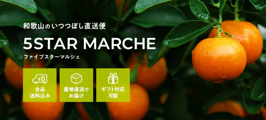 5STAR MARCHEは、食材にこだわりを持つ和歌山県の生産者と全国の消費者をつなぐ、産地直送の通販サイトです。和歌山県内各地の豊かな自然の中で育てられた旬の食材を豊富に取り揃えています。